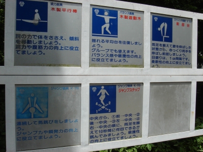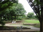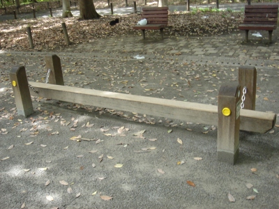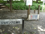 大久保地区は大きくL型になっていて、写真は明治通りからの入口付近の写真です。散歩やジョギングする人の姿をよく見かけます。ジョギング広場Bと書いてある広場には、体を鍛えるためのアスレチック?がありました。早朝とか結構利用されているんでしょうか・・・。