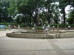 公園管理事務所の前にはいこいの広場があります。噴水のある広場でした。その奥に、プレーパーク活動をしている人たちが作った大きなハンモックがあったので、写真を取りに行ったのですが、怪我をした人がいて点検のため撤去されたあとでした。残念・・・。以前遊びに来た時は、このハンモックが一番たのしかったとウチの子は言っていました。