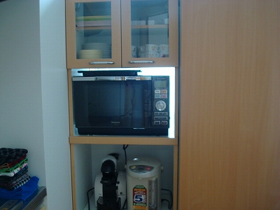 角にミニキッチンがあって(ガラスブロックが素敵~)、中に、流し台や冷蔵庫、電子レンジ、ポットなどがありました。